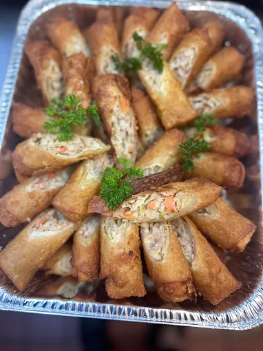 24 pcs. fried chicken eggrolls with sweet chili sauce.  Serves 8